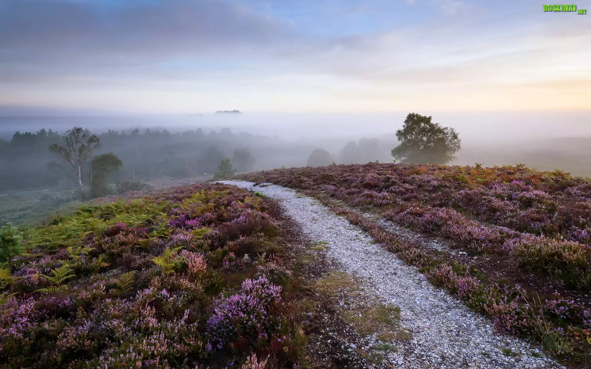 Rośliny: Droga, Wzgórze, Wrzosy, Wrzosowisko, Mgła, Drzewa, Poranek