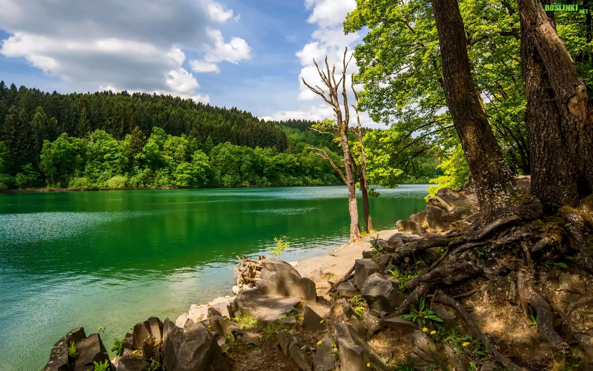 Rośliny: Rzeka, Wzgórze, Las, Drzewa, Kamienie, Niebo, Chmury