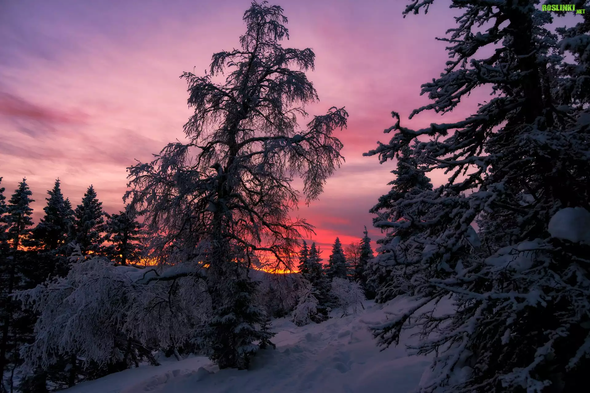 Rośliny: Wzgórze, Las, Drzewa, Zima, Zachód słońca