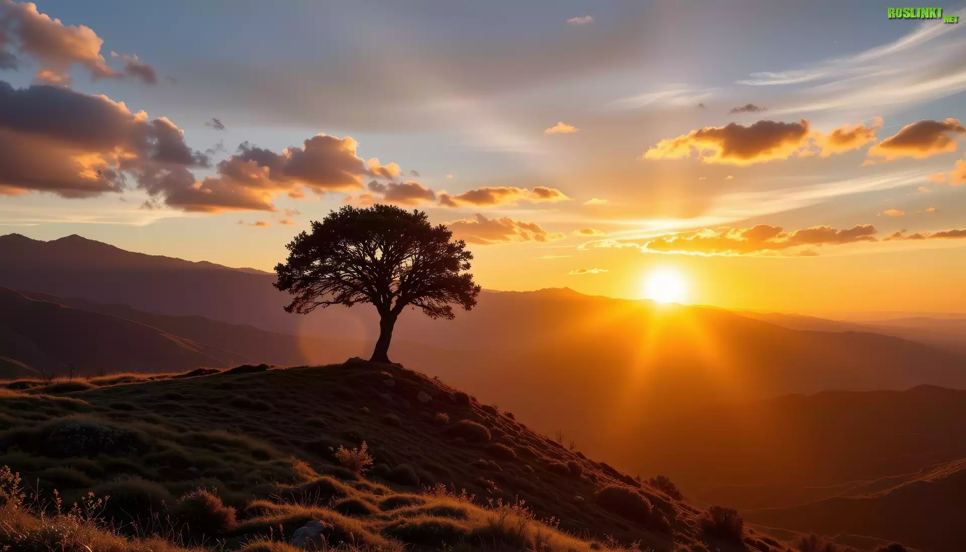 Rośliny: Drzewo, Wzgórze, Zachód słońca, Góry