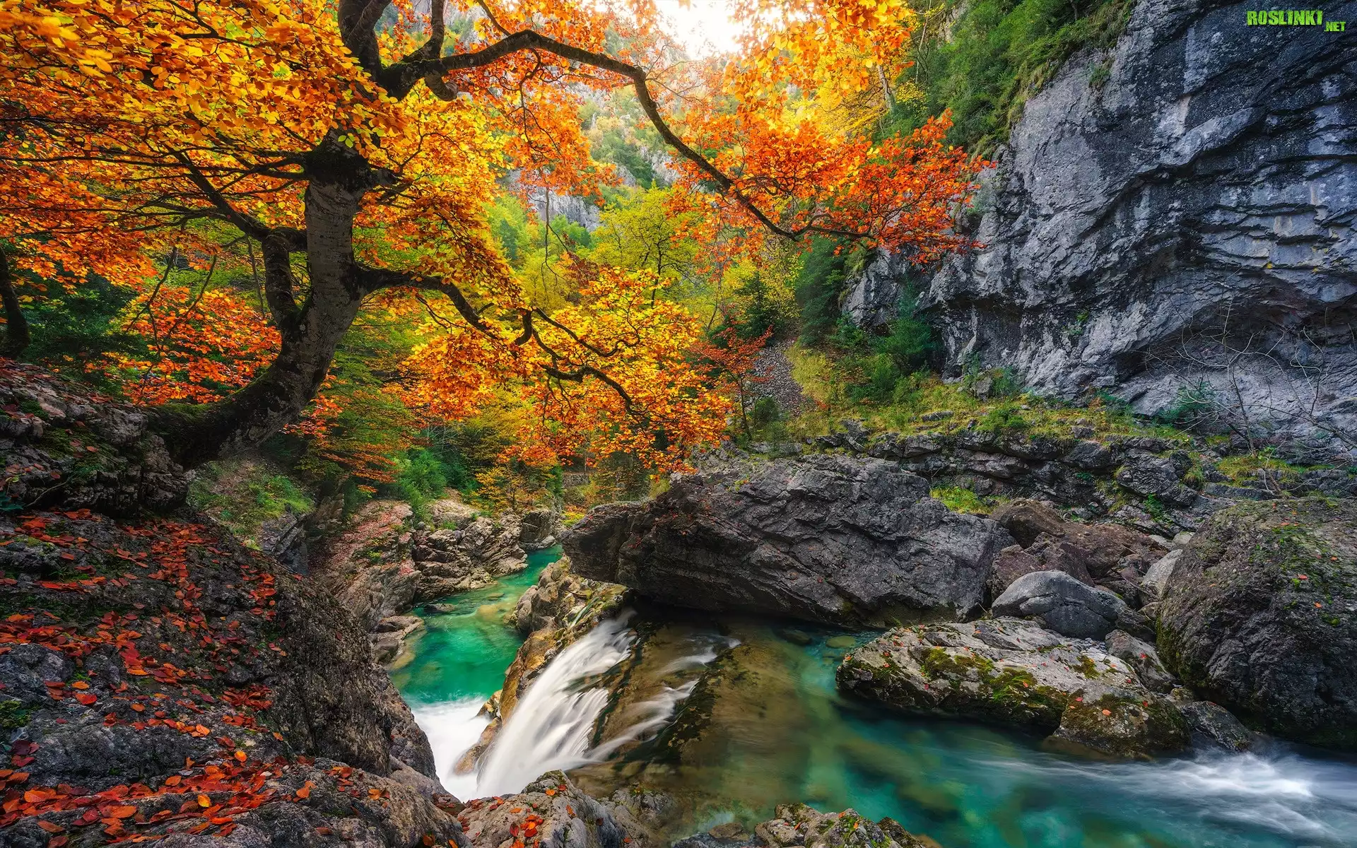Hiszpania, Huesca, Park Narodowy de Ordesa y Monte Perdido, Drzewa, Las, Rzeka, Jesień, Skały, Kaskada, Liście |