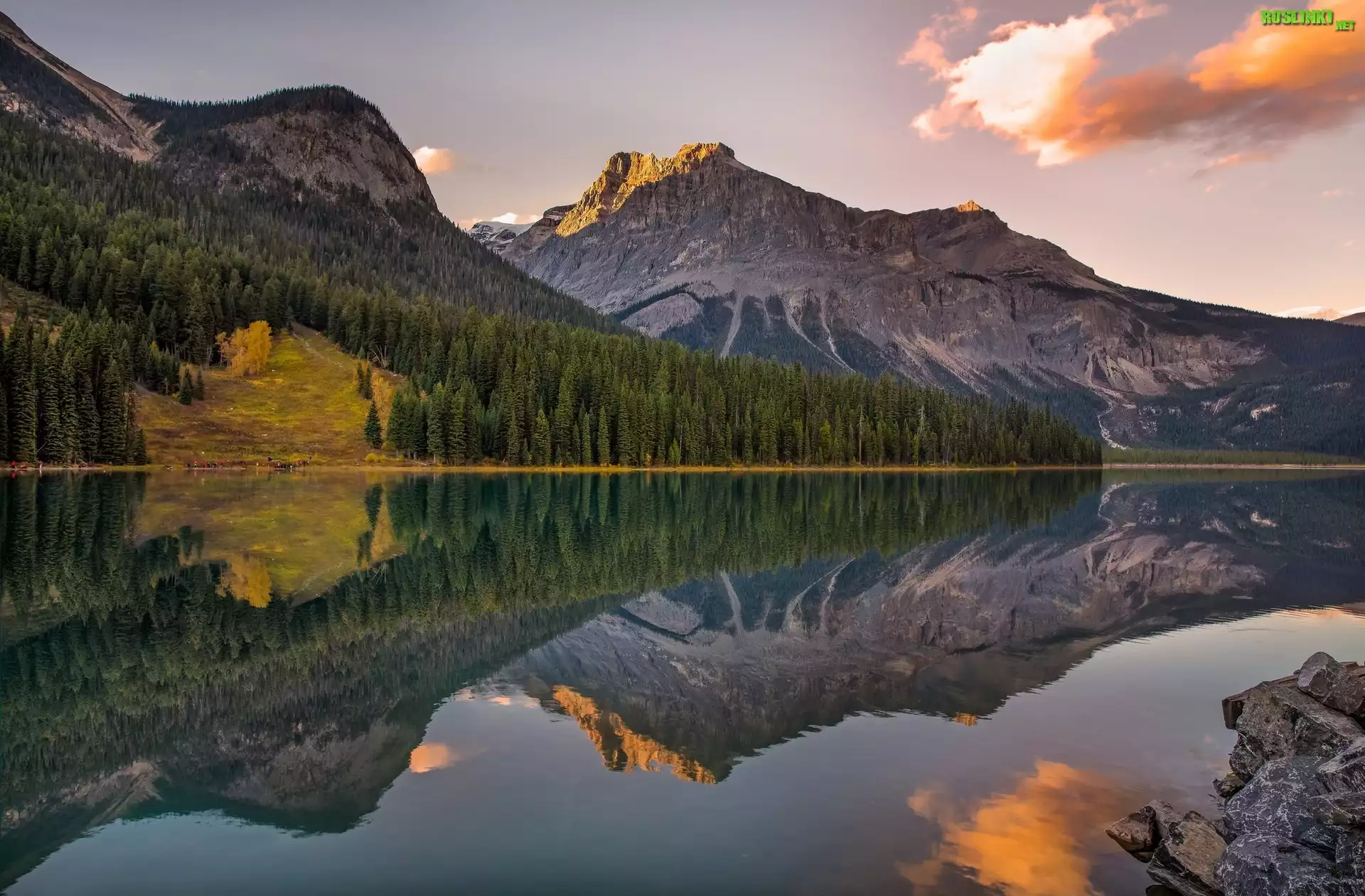 Rośliny: Kanada, Kolumbia Brytyjska, Park Narodowy Yoho, Jezioro Emerald Lake, Góry, Świerki, Odbicie