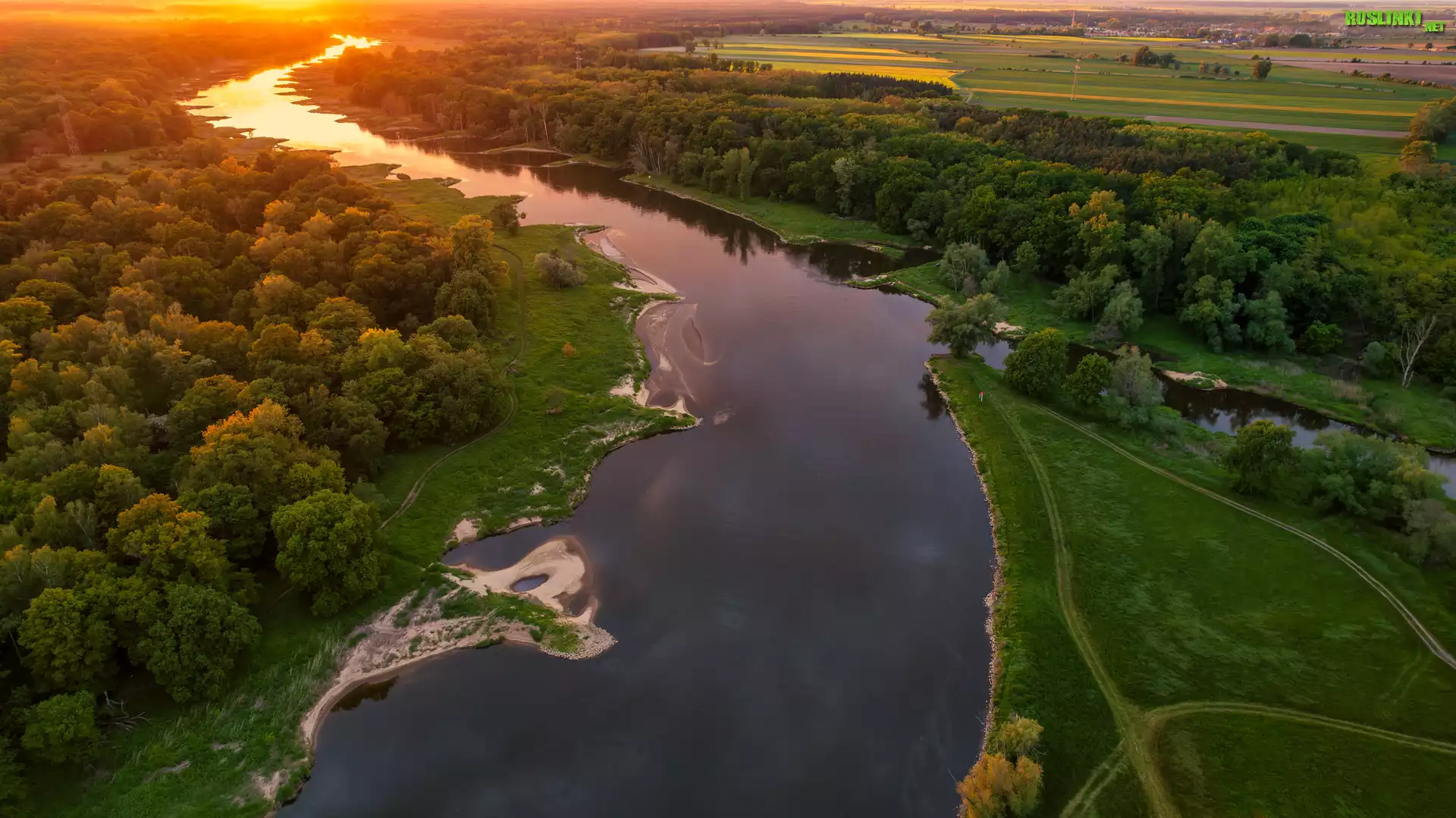 Rośliny: Polska, Gmina Szlichtyngowa, Rzeka, Odra, Drzewa, Pola, Zachód słońca, Z lotu ptaka