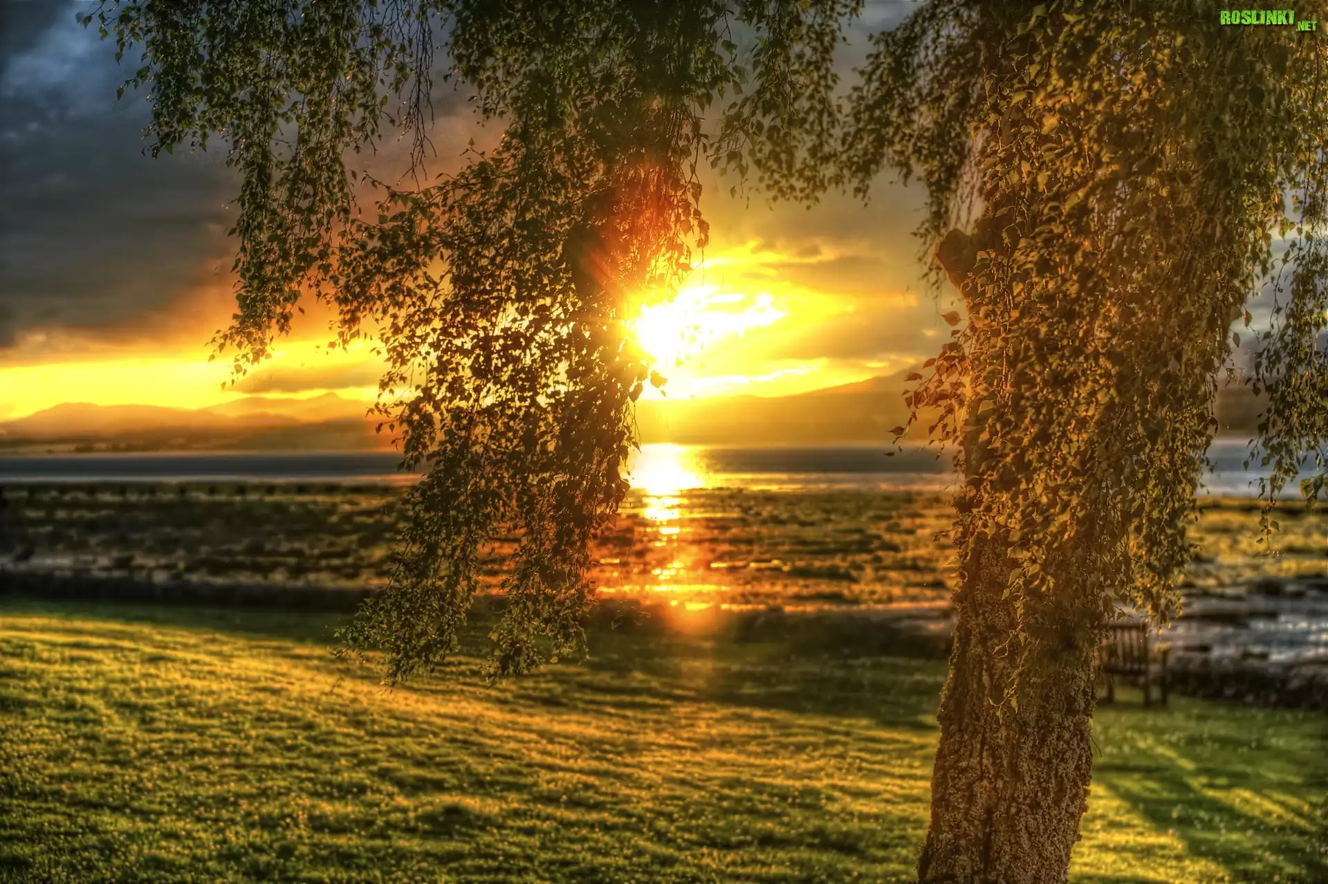 Rośliny: Zachód, Słońca, Łąka, Drzewo