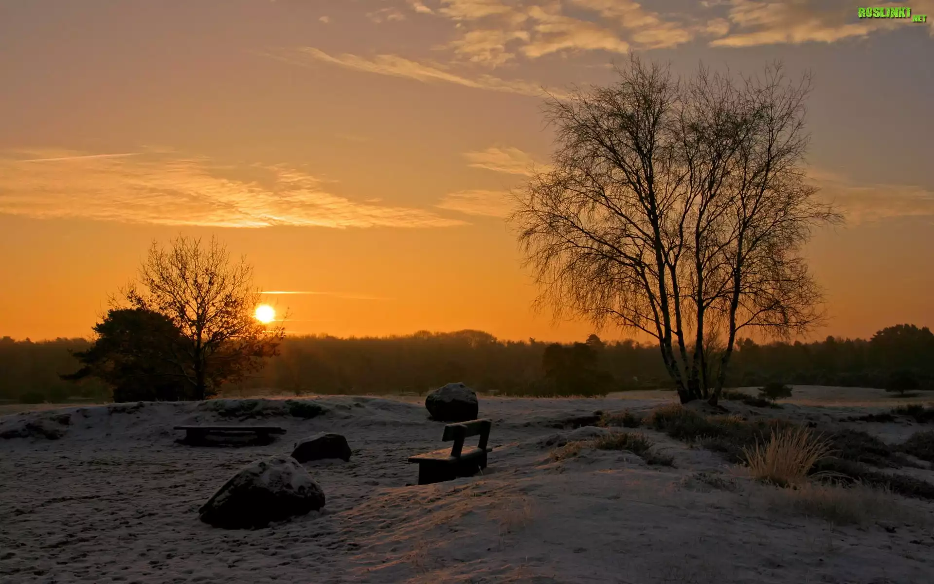 Rośliny: Zachód, Słońca, Drzewa, Krzewy, Ławeczka, Śnieg