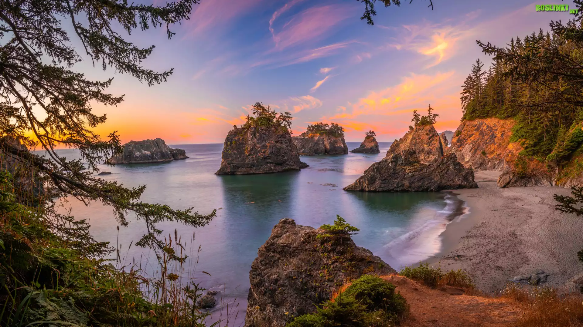 Morze, Skały, Brzeg, Drzewa, Niebo, Zachód słońca, Park stanowy, Samuel H Boardman State Scenic Corridor, Oregon, Stany Zjednoczone |