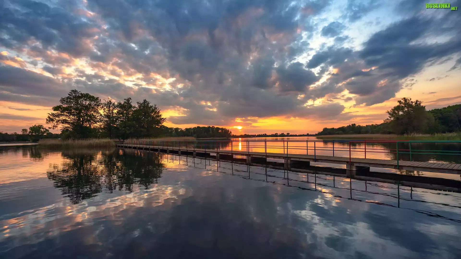 Rośliny: Zachód słońca, Jezioro, Most, Chmury, Drzewa
