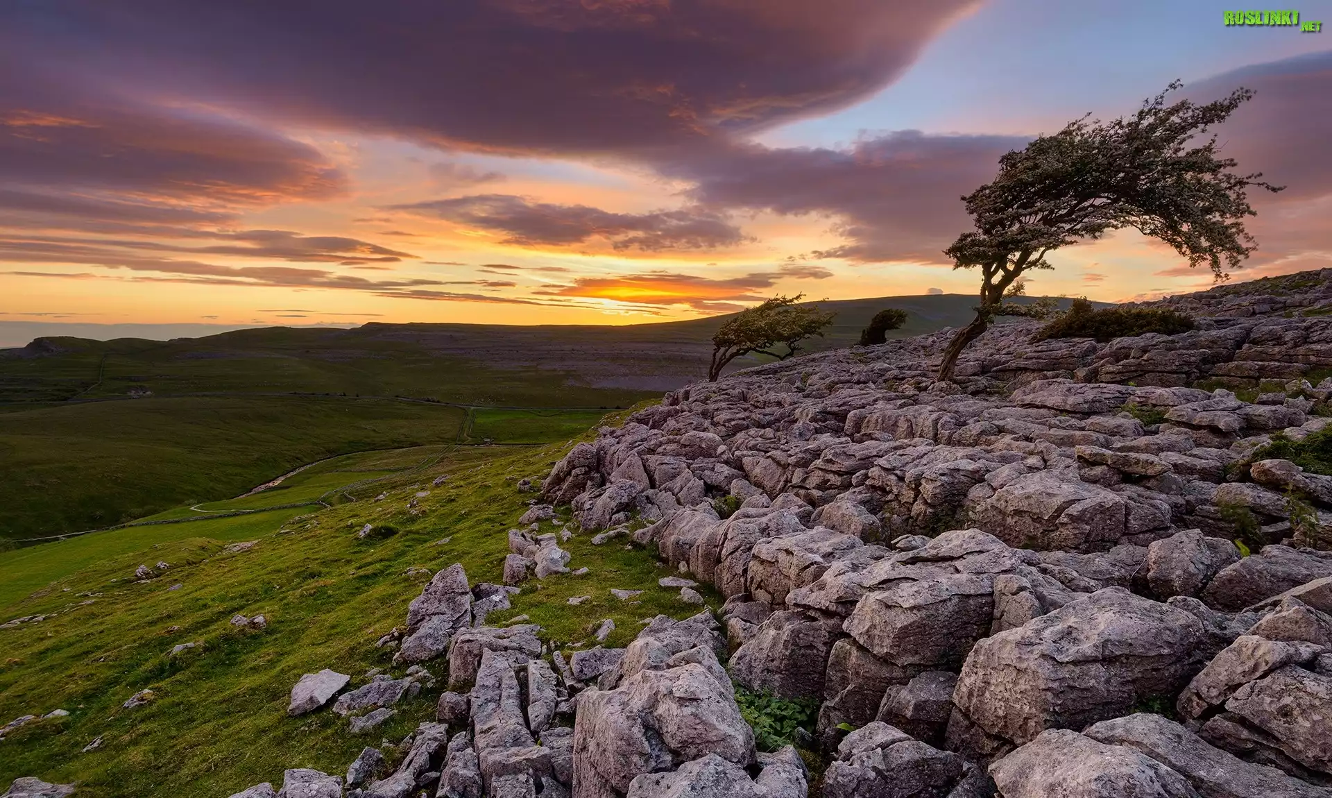 Rośliny: Wzgórza, Drzewa, Kamienie, Zachód słońca, Chmury