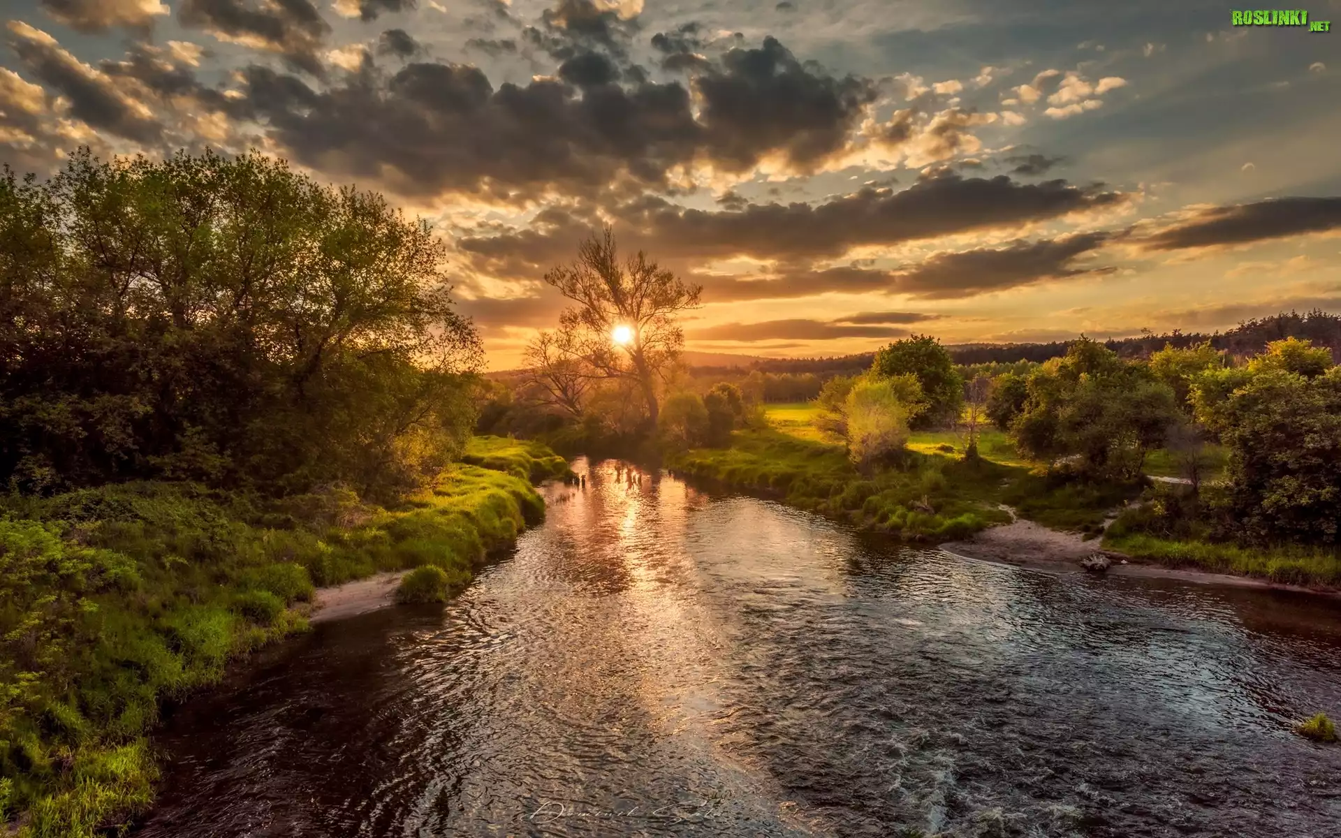 Rośliny: Rzeka, Drzewa, Krzewy, Zachód słońca, Chmury