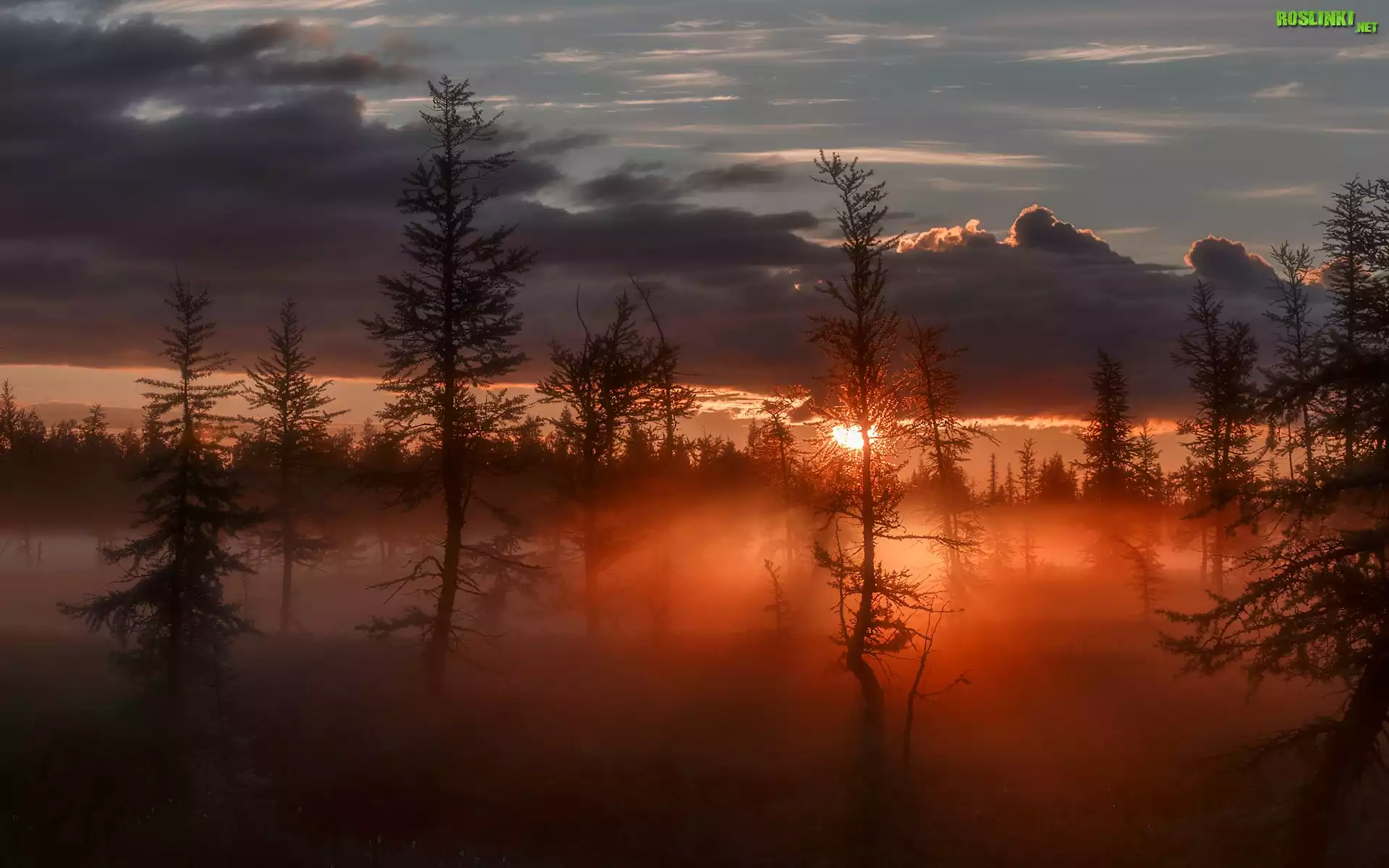 Rośliny: Zachód, Słońca, Mgła, Chmury, Drzewa