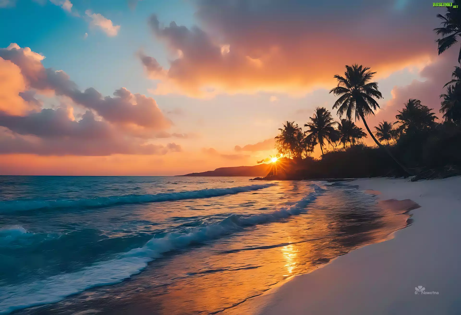 Morze, Plaża, Palmy, Zachód słońca, Chmury