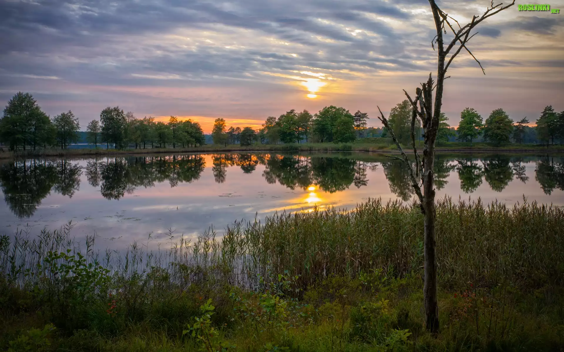 Rośliny: Jezioro, Drzewa, Roślinność, Zachód słońca, Chmury