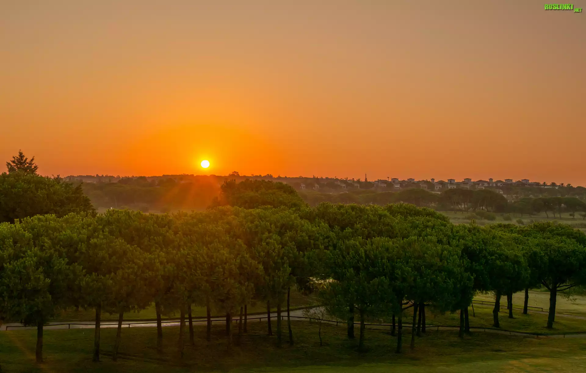 Rośliny: Zachód słońca, Drzewa, Domy, Wzgórze