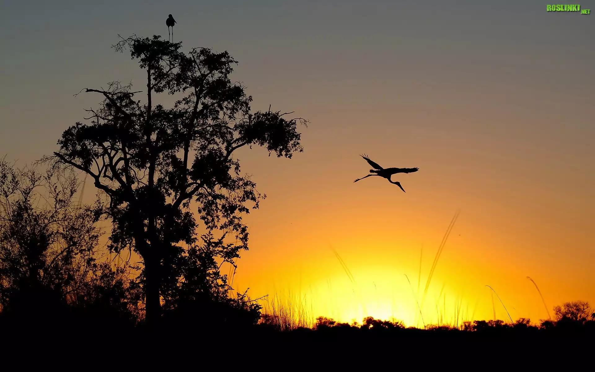Zachód słońca, Łąka, Drzewa, Ptaki