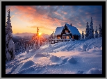 Zima, Dom, Góry, Zachód słońca, Drzewa