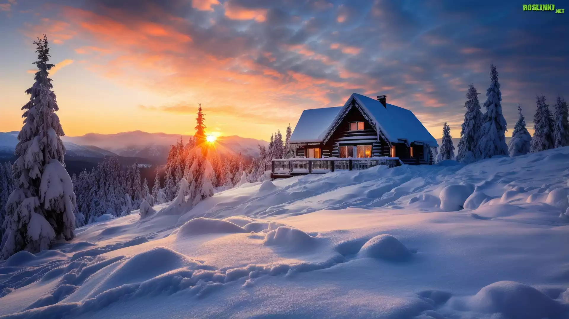 Rośliny: Zima, Dom, Góry, Zachód słońca, Drzewa
