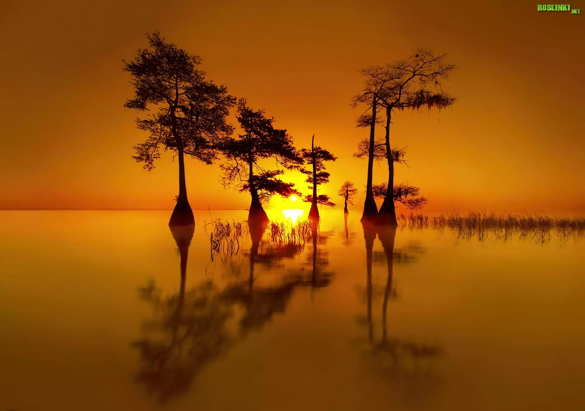 Rośliny: Zachód, Słońca, Jezioro, Drzewa, Odbicie