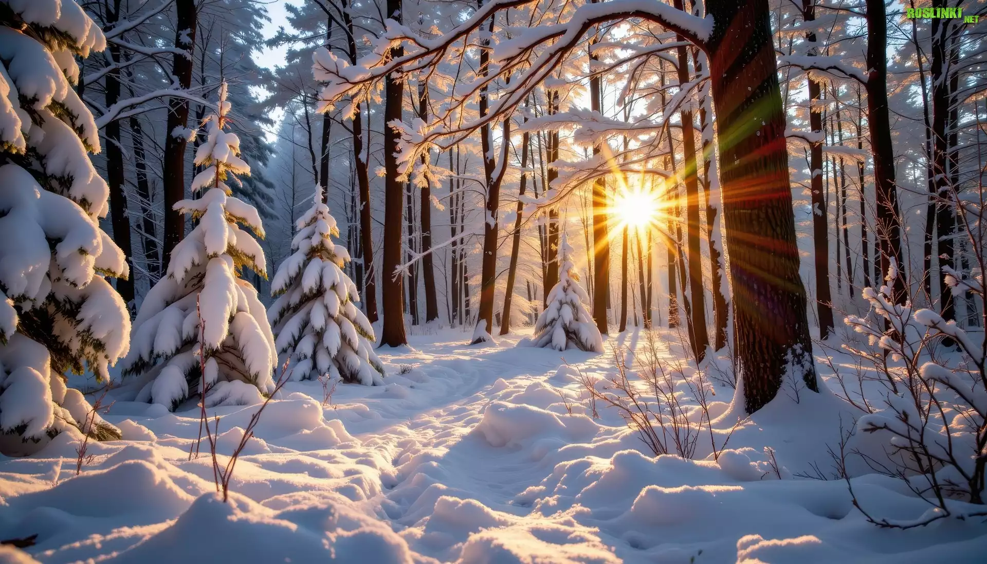 Rośliny: Zima, Las, Drzewa, Zachód słońca, Grafika AI