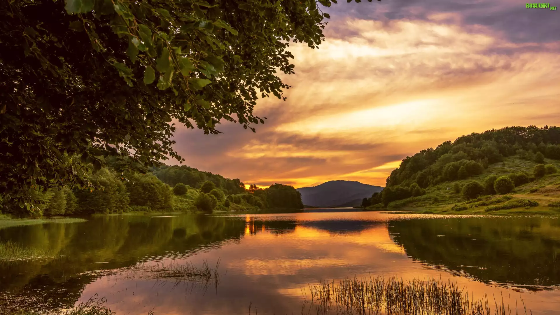 Rośliny: Zachód słońca, Rzeka, Drzewa, Wzgórza