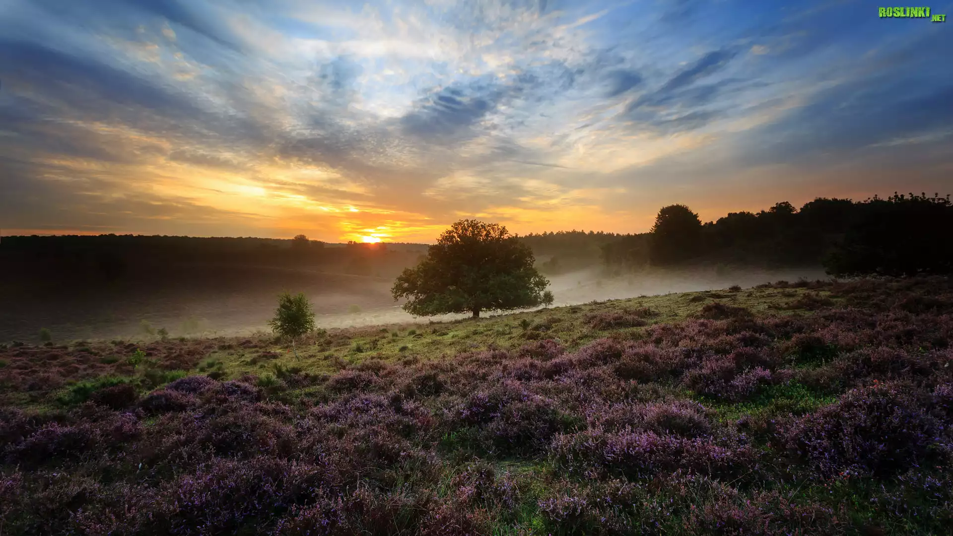 Rośliny: Zachód słońca, Wrzosowisko, Wrzosy, Drzewa, Mgła