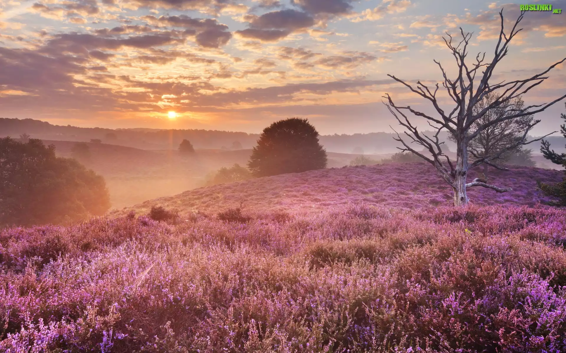 Drzewa, Zachód słońca, Wrzosy, Wrzosowisko