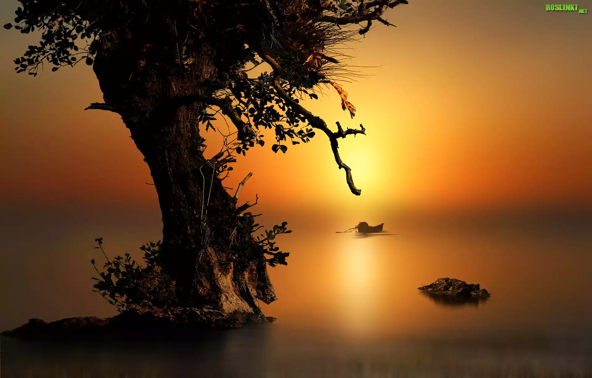Zachód, Słońca, Jezioro, Drzewo, Łódka