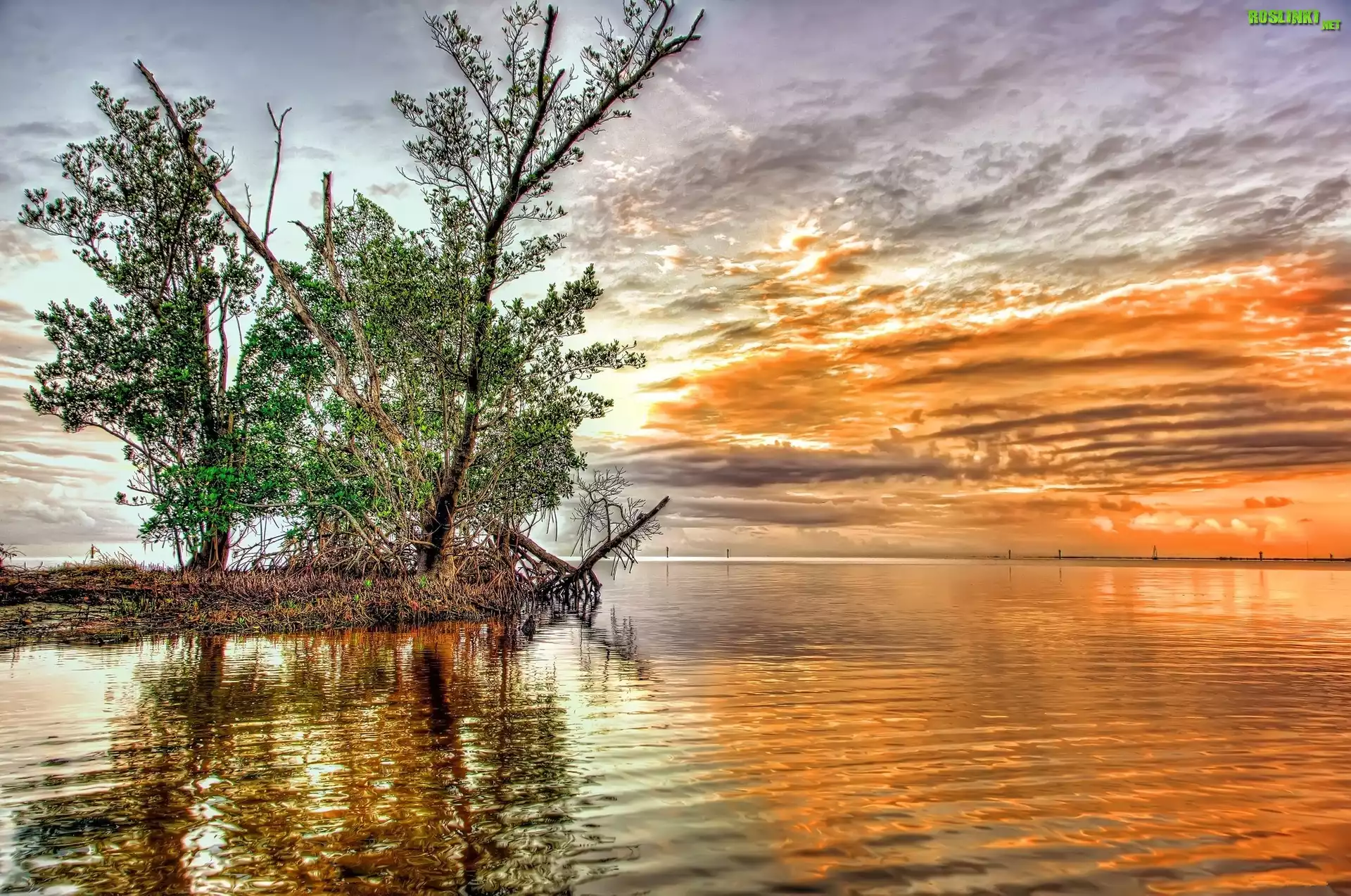 Rośliny: Zachód, Słońca, Drzewo, Jezioro