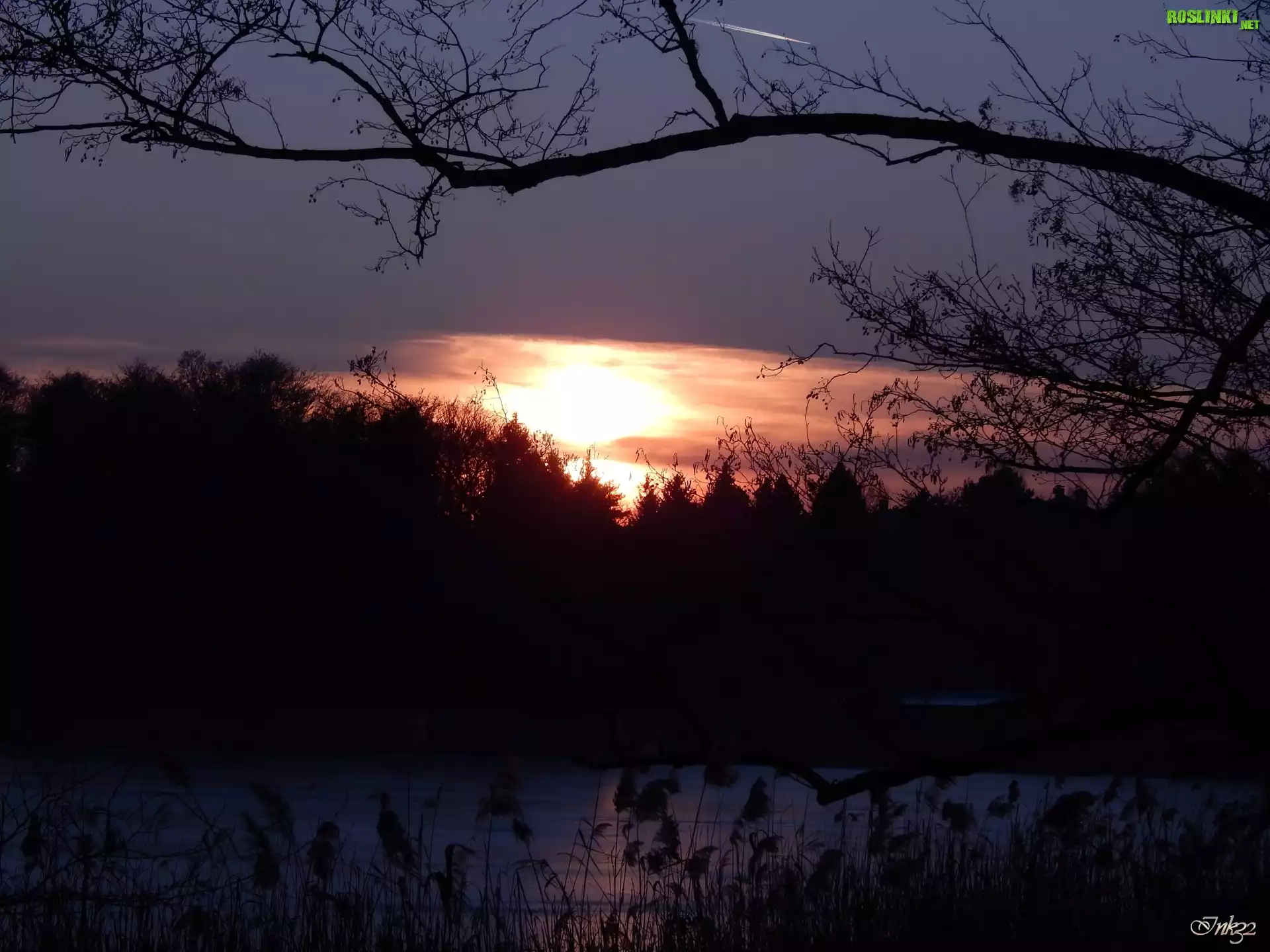 Zachód, Słońca, Drzewa, Gałęzie, Trzcina