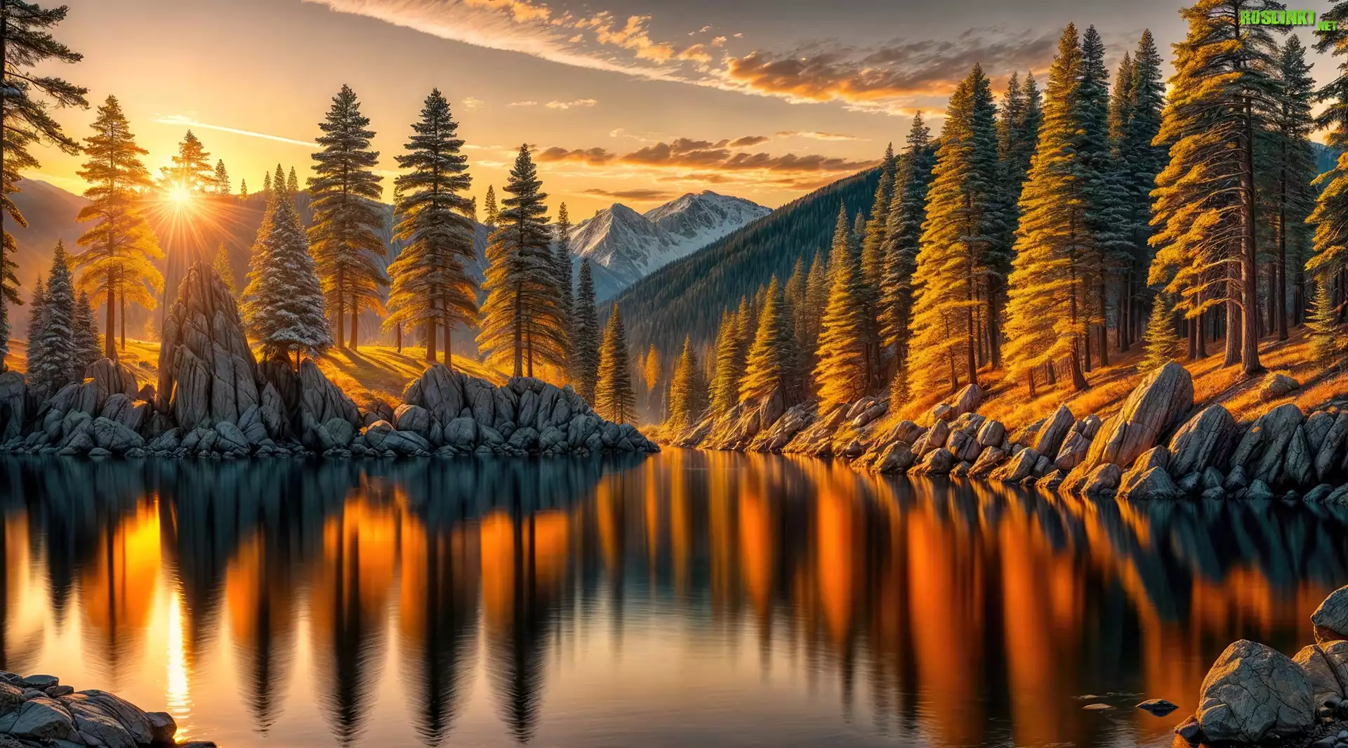 Rośliny: Jezioro, Drzewa, Góry, Zachód słońca, Jesień, Grafika