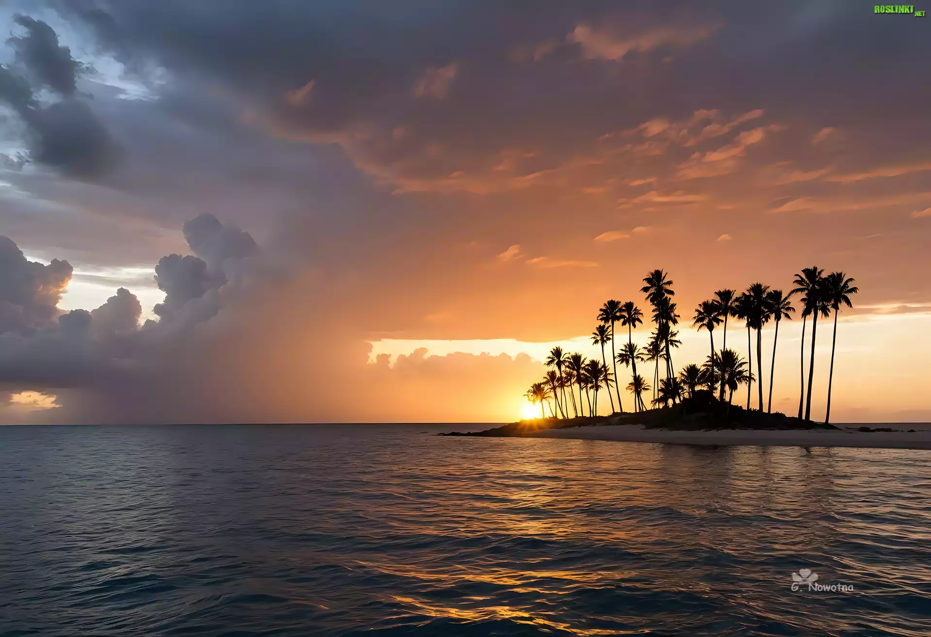 Rośliny: Ocean, Wyspa, Palmy, Zachód słońca, Grafika