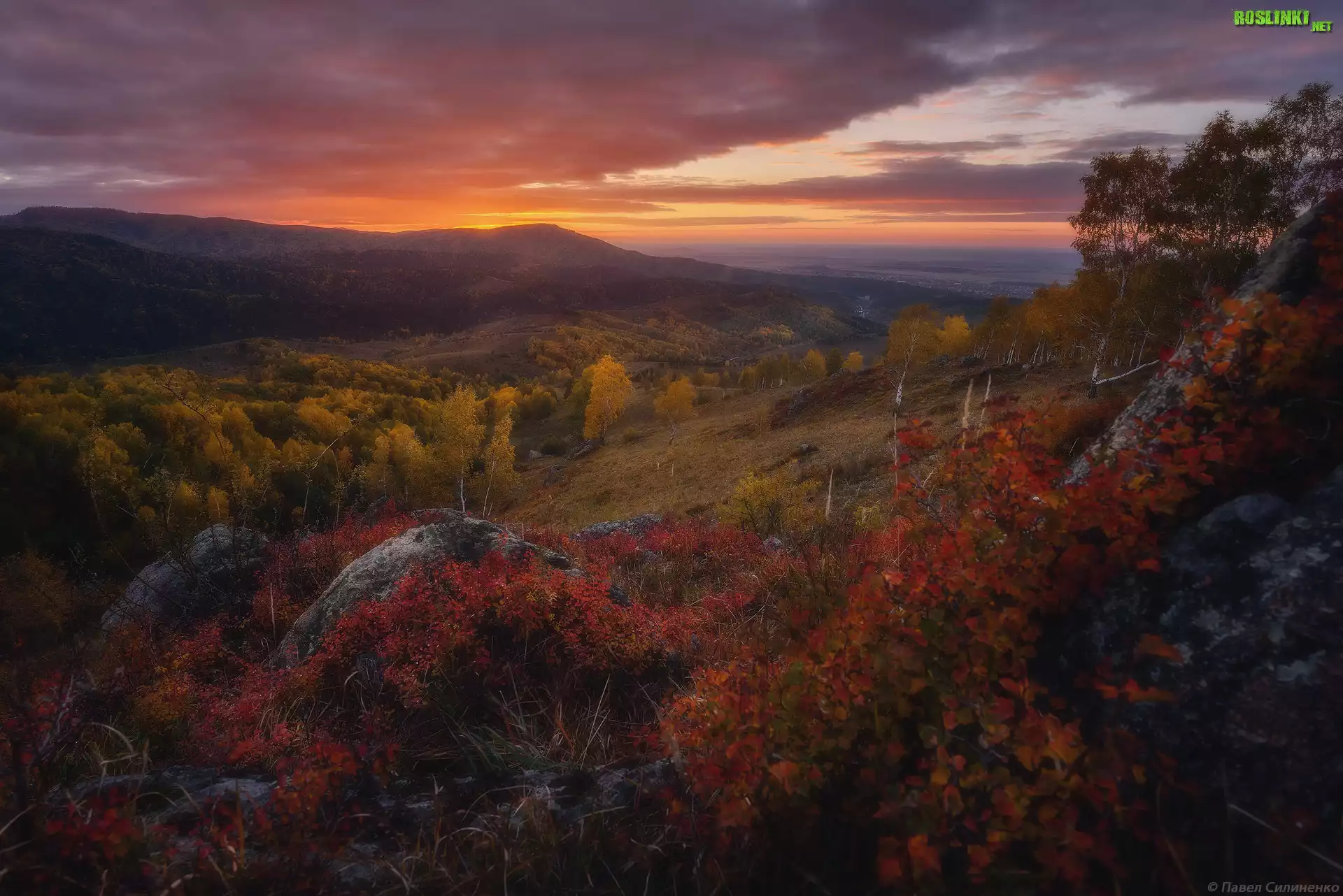 Rośliny: Góry Ałtaj, Zachód słońca, Jesień, Brzozy, Drzewa, Skały, Republika Ałtaju, Rosja