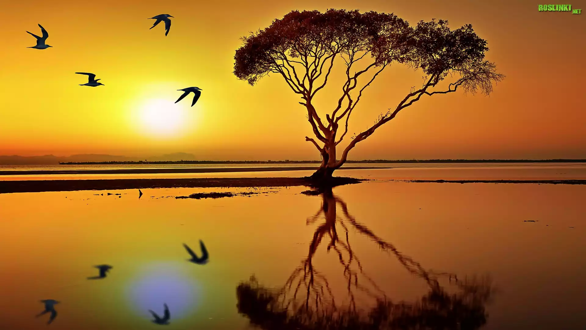 Rośliny: Zachód, Słońca, Jezioro, Drzewo