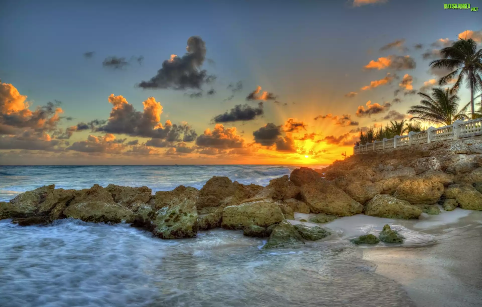 Rośliny: Zachód, Słońca, Morze, Kamienie, Palmy