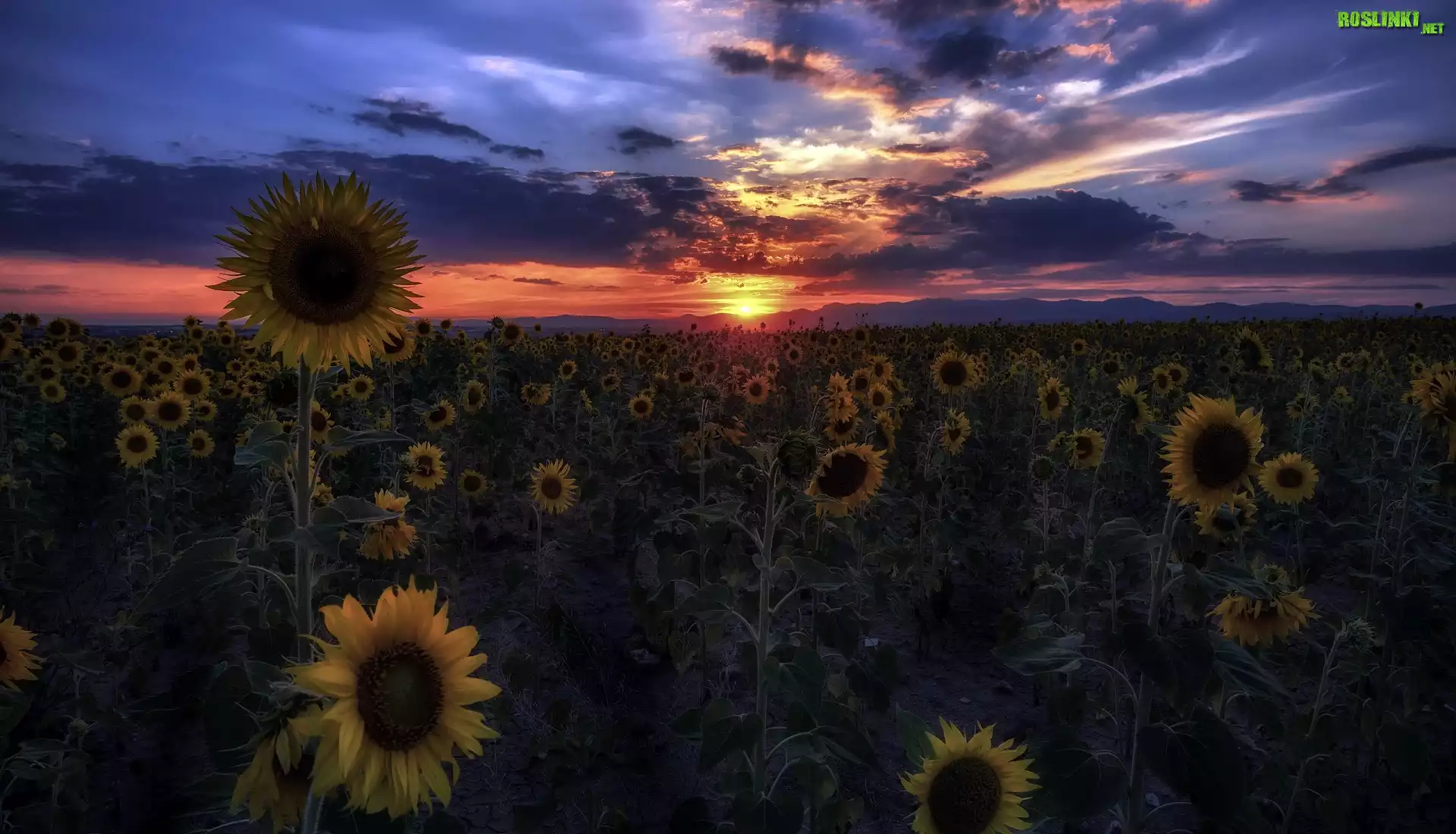 Rośliny: Zachód słońca, Pole, Kwiaty, Słoneczniki