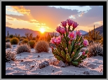 Zachód słońca, Piasek, Kwitnący, Kaktus, Różowe, Kwiaty, Kępki, Roślin