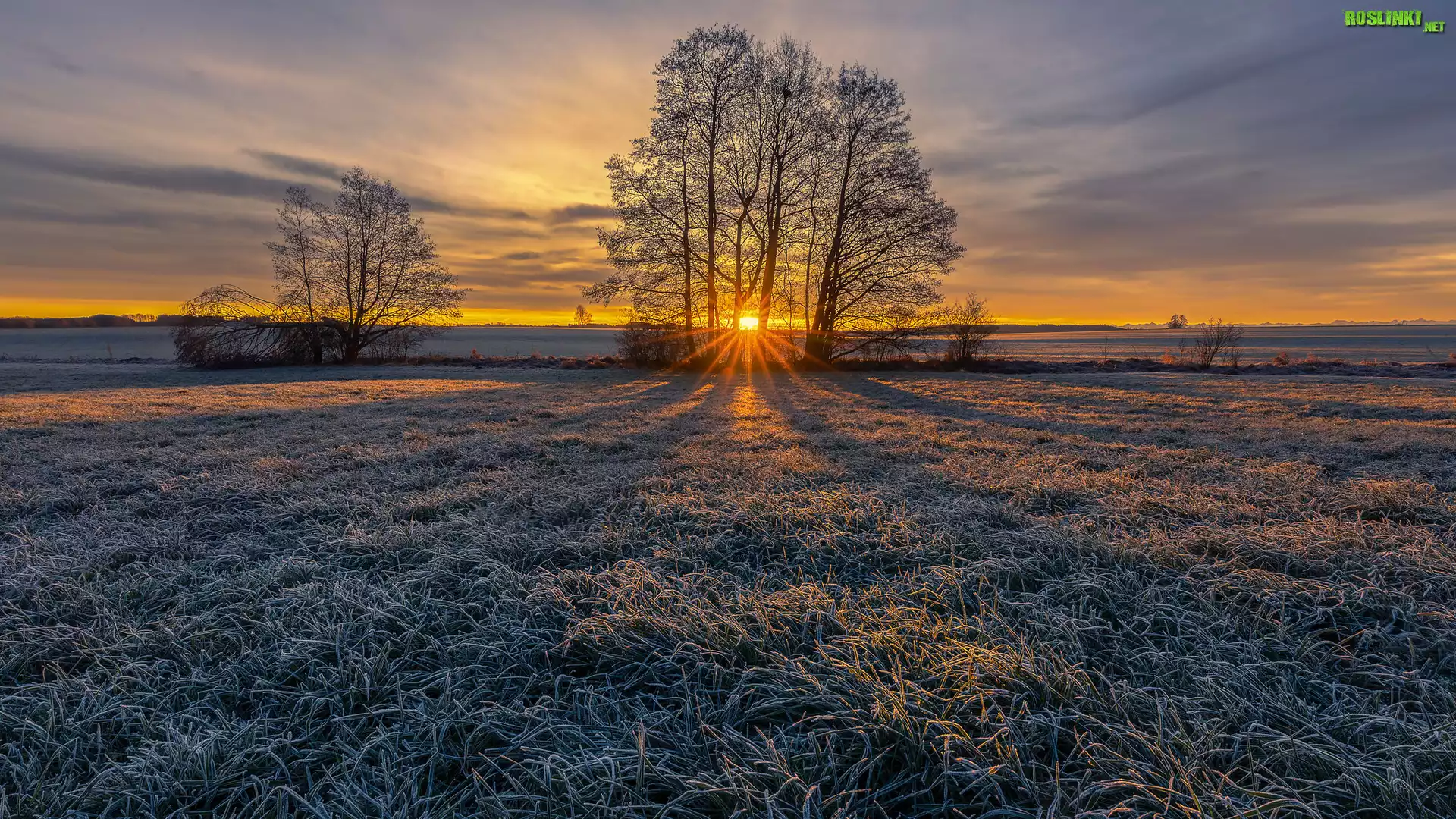 Rośliny: Polana, Szron, Drzewa, Zachód słońca, Łąka