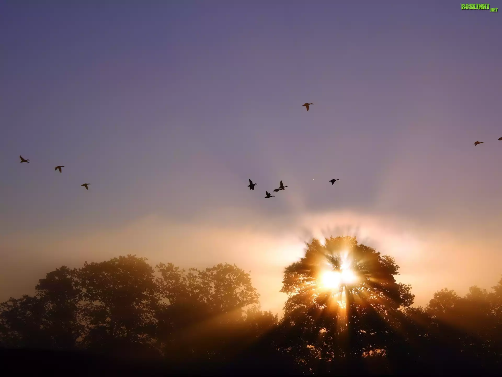 Rośliny: Zachód, Słońca, Drzewa, Lot, Ptaków