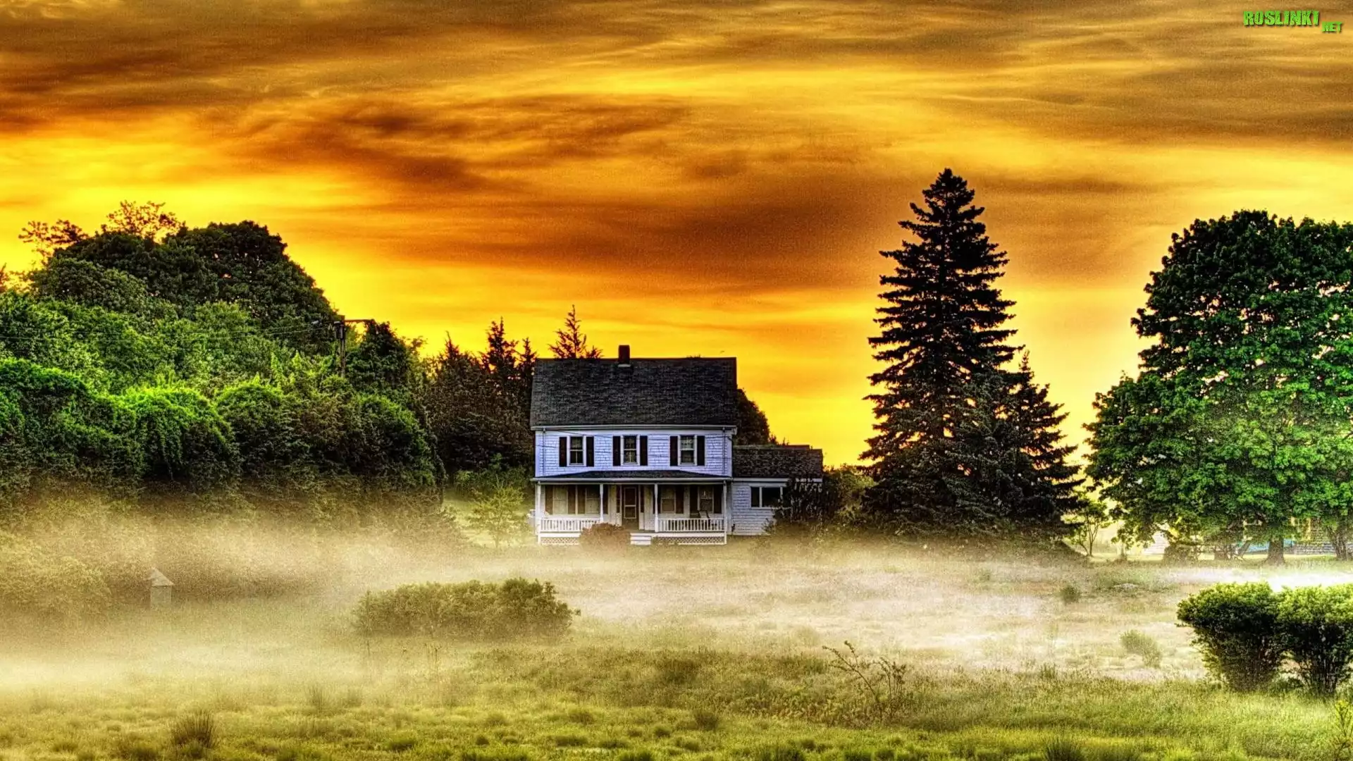 Rośliny: Zachód, Słońca, Drzewa, Mgła, Dom