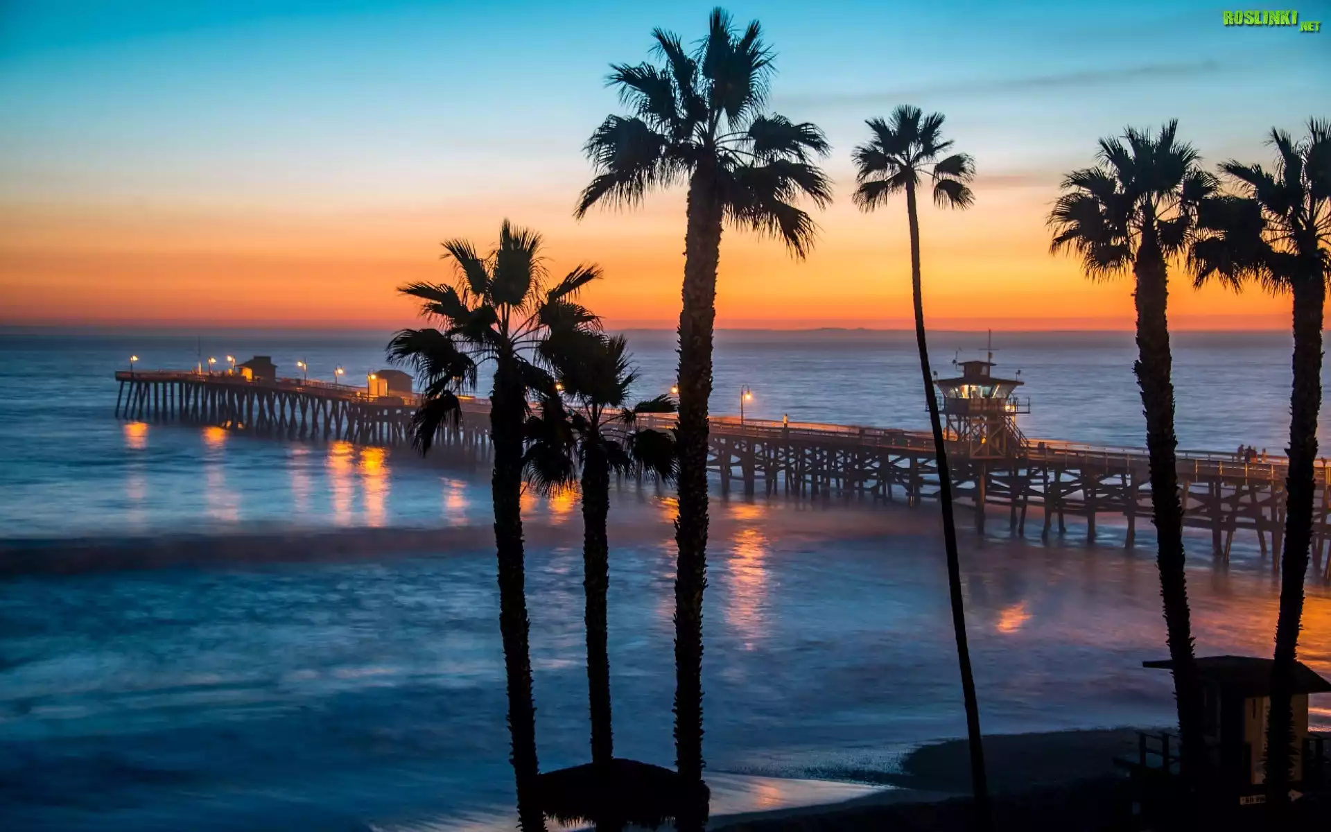 Rośliny: Zachód, Słońca, Morze, Molo, Palmy