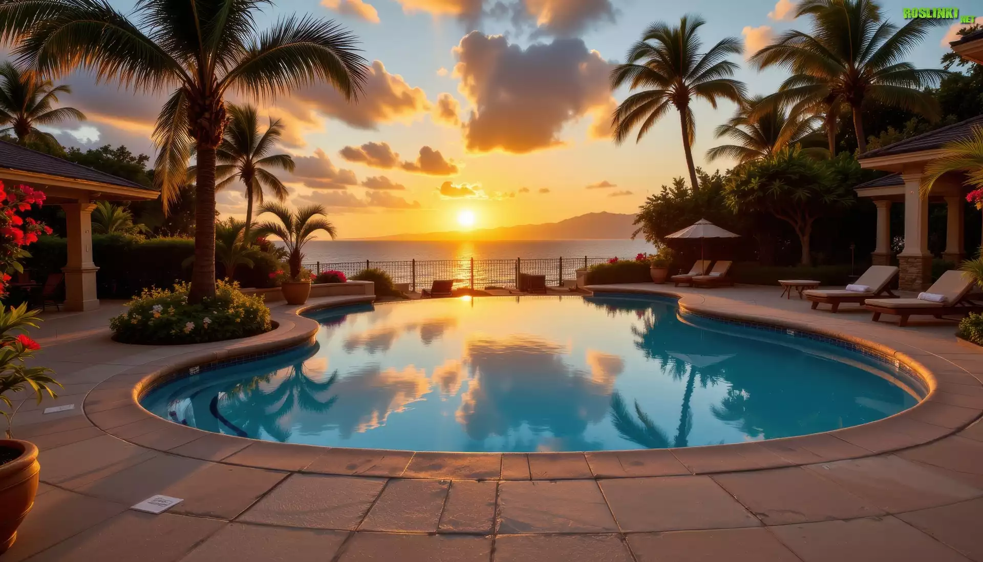 Rośliny: Basen, Palmy, Morze, Zachód słońca, Grafika AI
