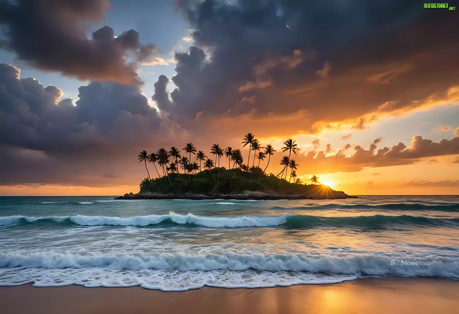 Rośliny: Wyspa, Palmy, Morze, Zachód słońca, Niebo