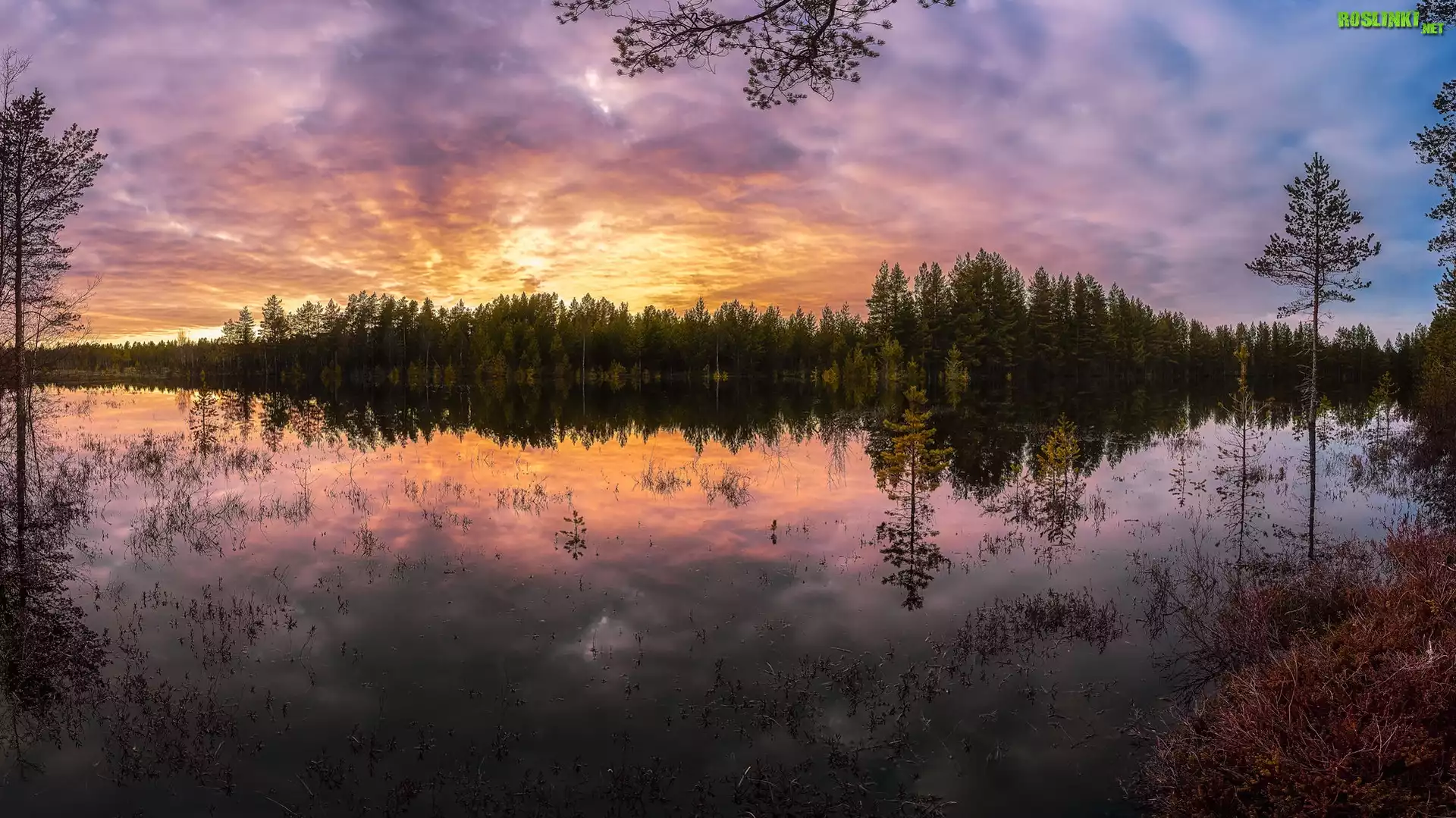 Rośliny: Jezioro, Las, Drzewa, Zachód słońca, Odbicie