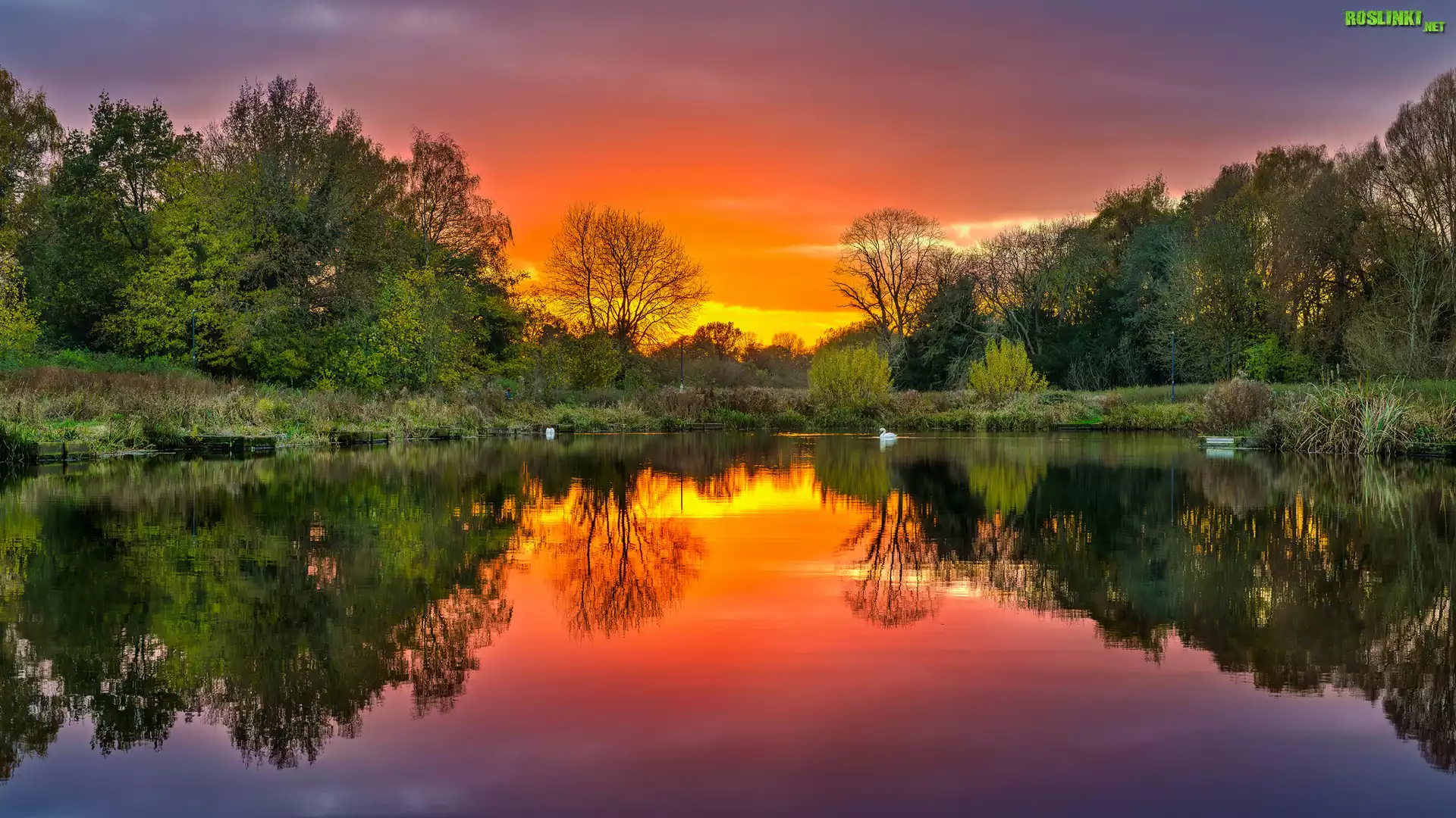 Rośliny: Staw, Drzewa, Odbicie, Zachód słońca, Kolorowe, Niebo
