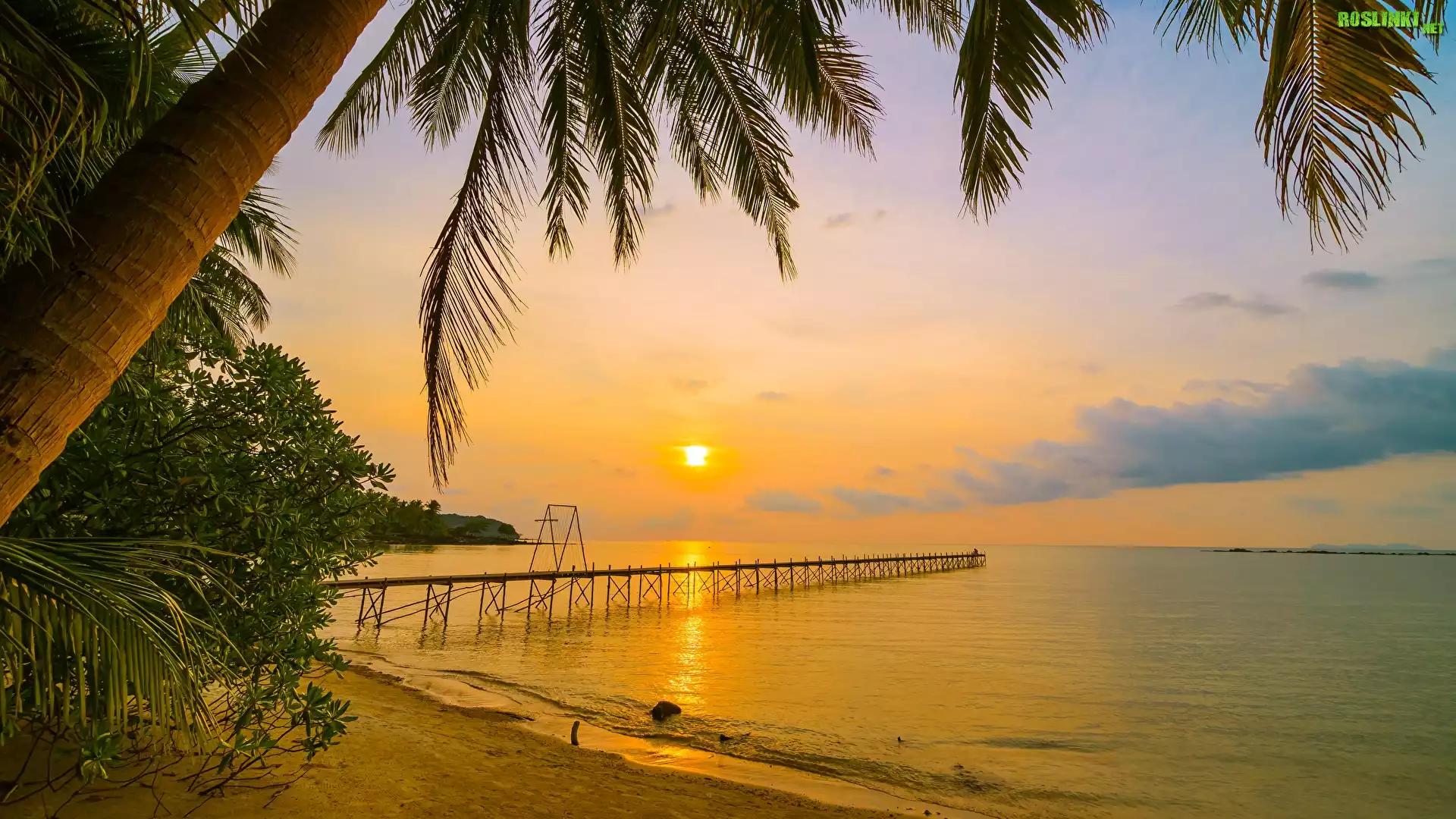 Rośliny: Zachód słońca, Morze, Plaża, Palmy, Molo