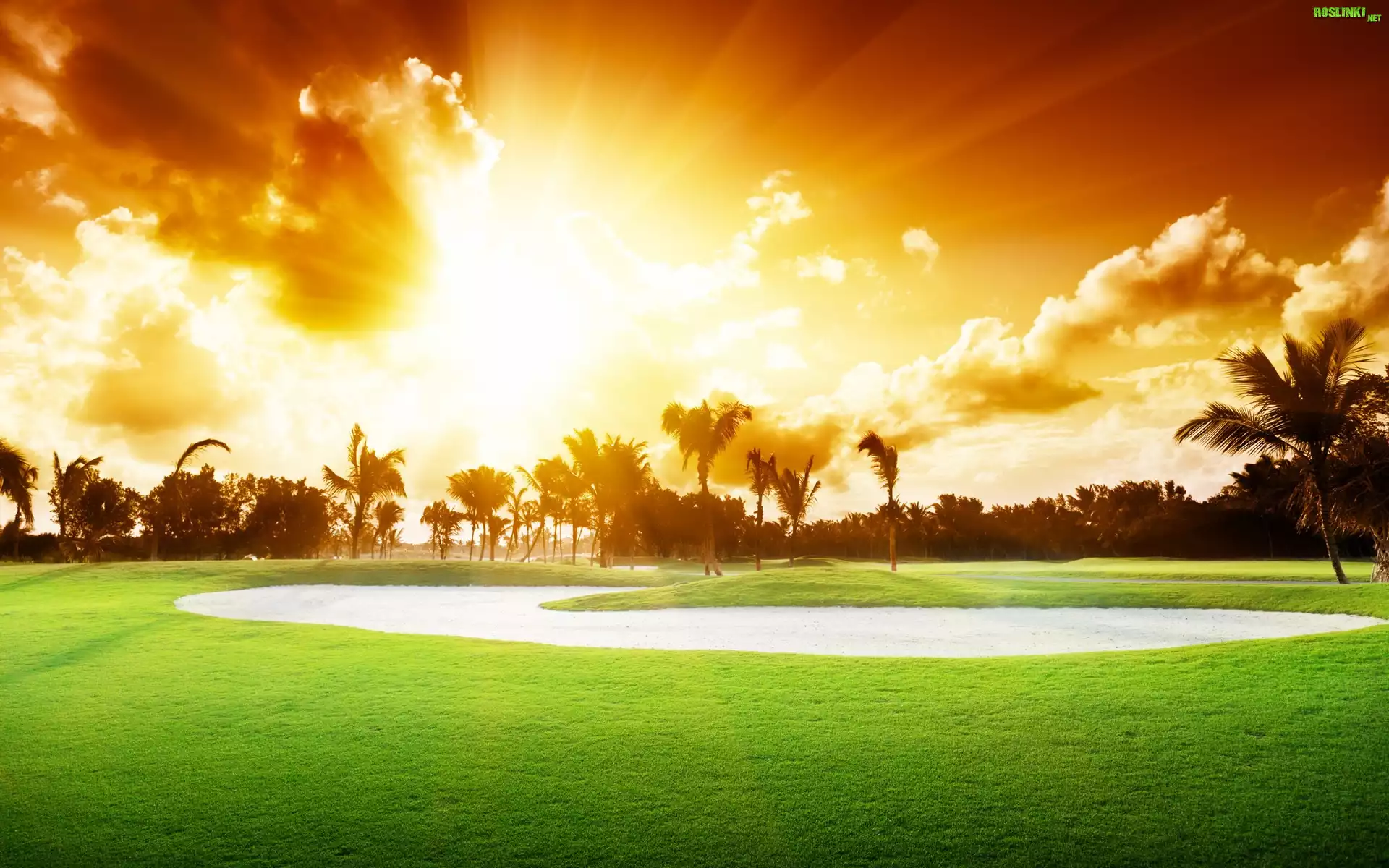 Rośliny: Zachód, Słońca, Palmy, Pole, Golfowe