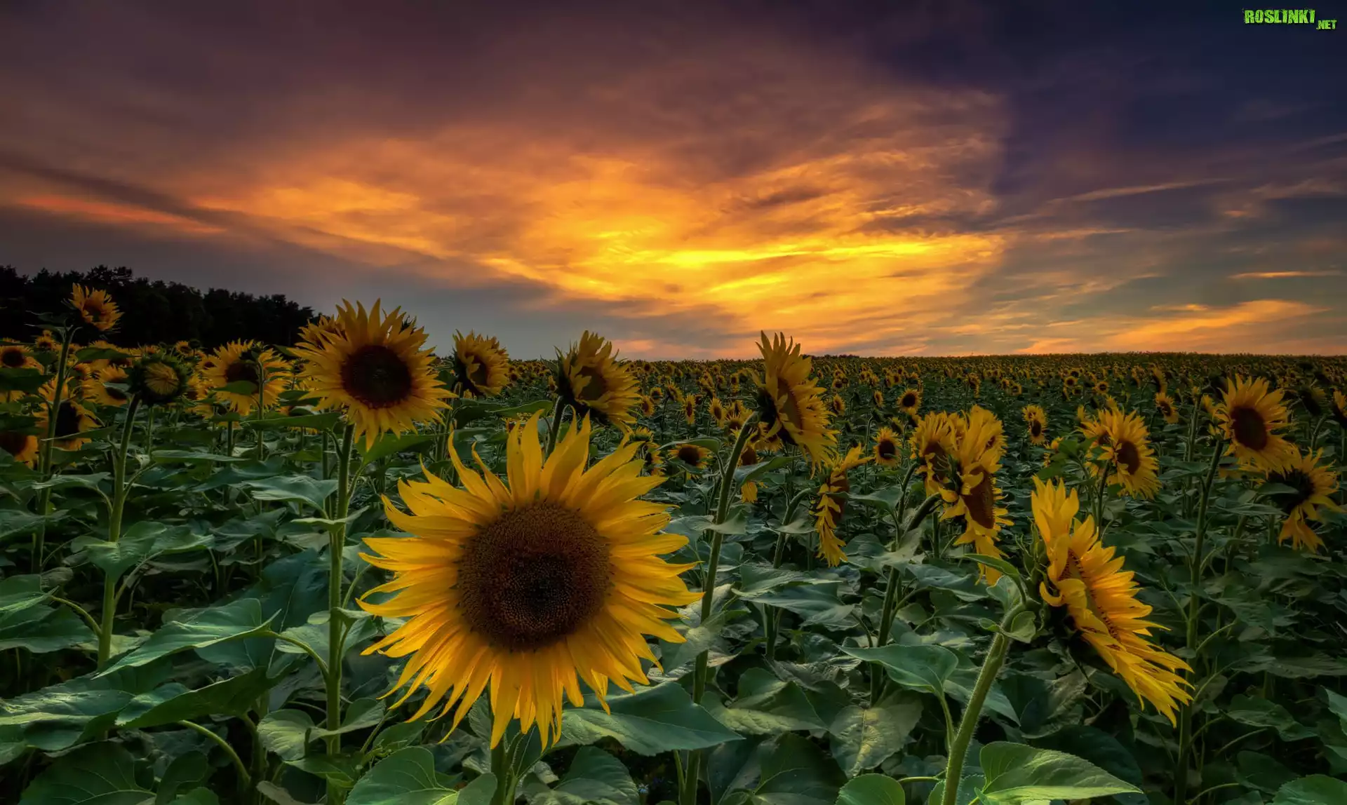 Rośliny: Zachód słońca, Pole, Słoneczniki