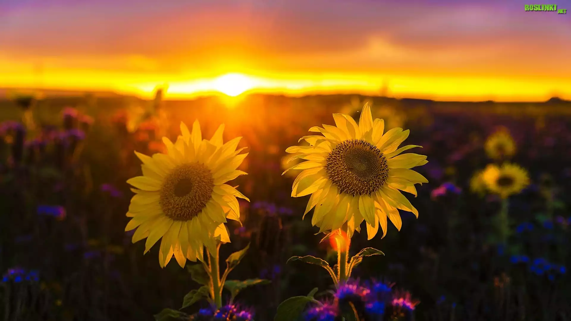 Rośliny: Zachód słońca, Pole, Słoneczniki