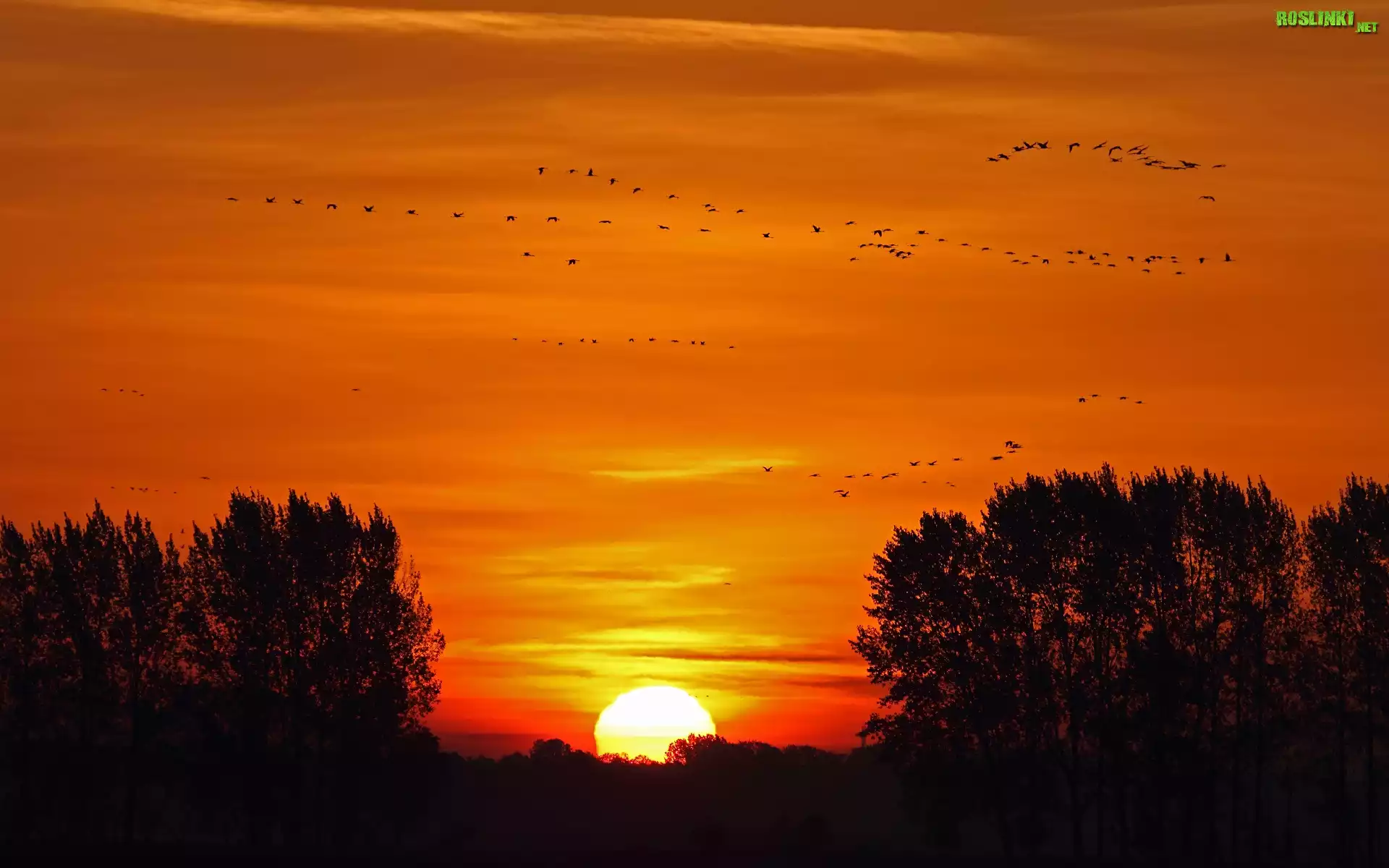 Rośliny: Zachód Słońca, Niebo, Klucz, Ptaków, Drzewa