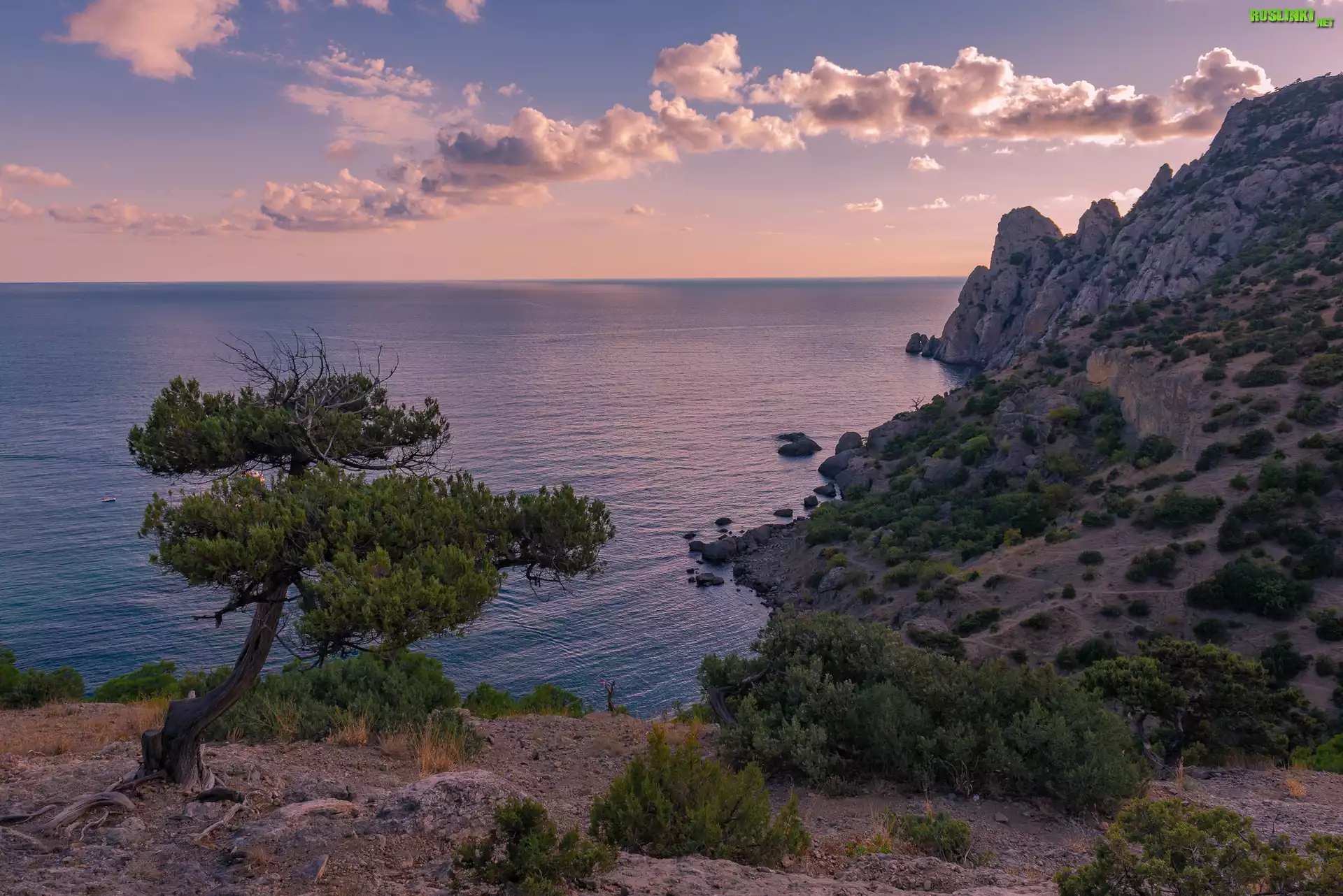 Rośliny: Morze, Zachód słońca, Chmury, Brzeg, Skały, Drzewo, Rośliny