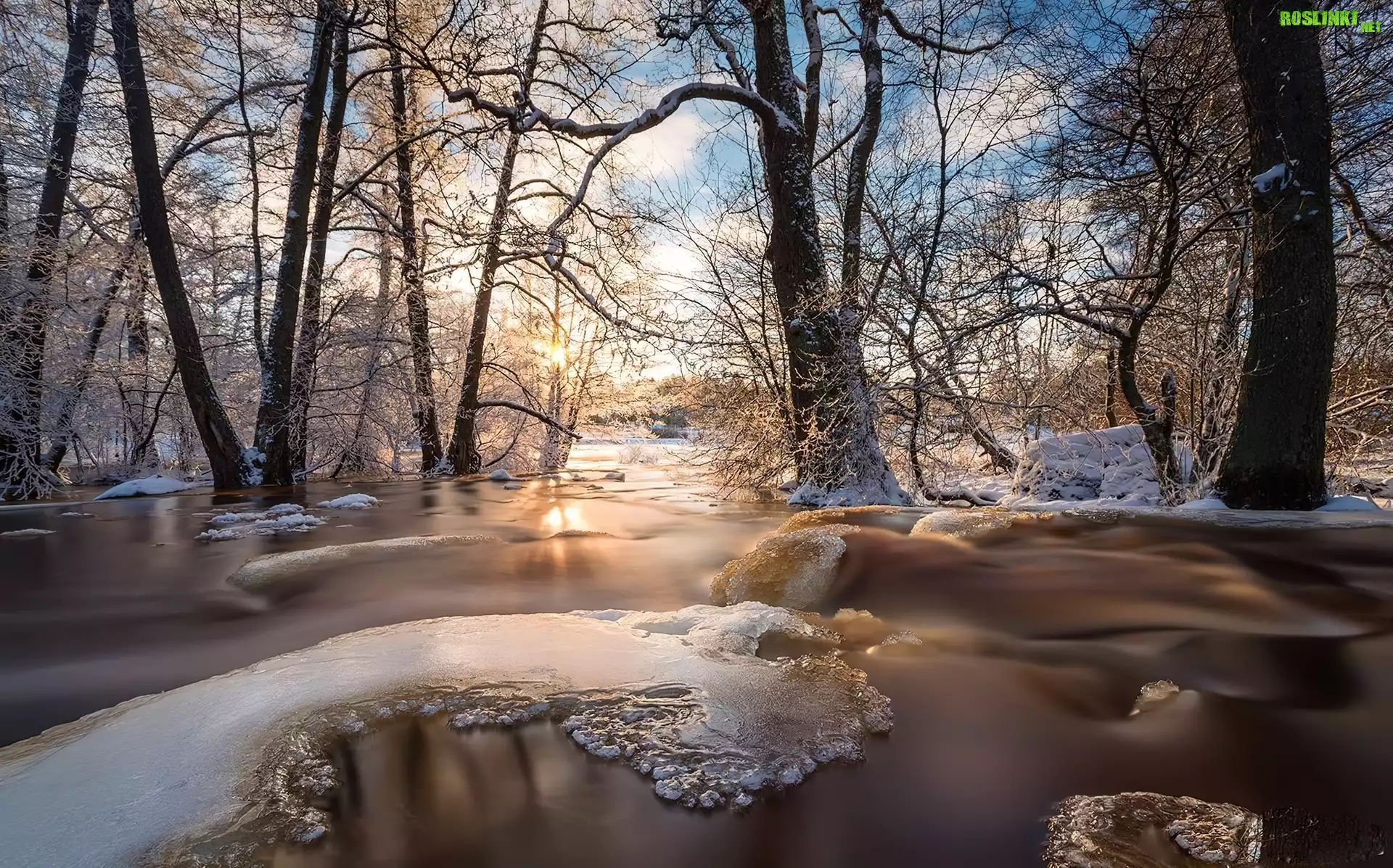 Rośliny: Zachód, Słońca, Drzewa, Rzeka, Śnieg